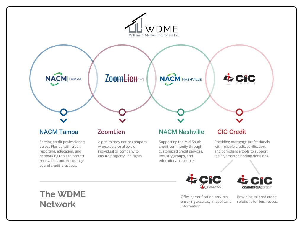 William D. Meeker Enterprises (WDME) is the parent company behind a family of specialized brands - including NACM Tampa - delivering strategic leadership, operational excellence, and industry expertise across credit reporting, education, compliance, and receivables protection services. WDME combines deep industry experience with a commitment to innovation, integrity, and measurable results to support both our members and affiliate organizations.